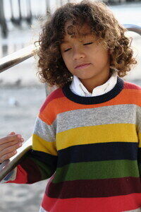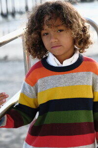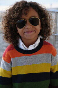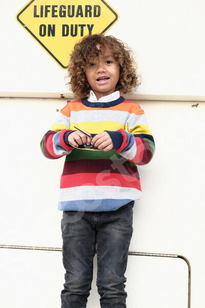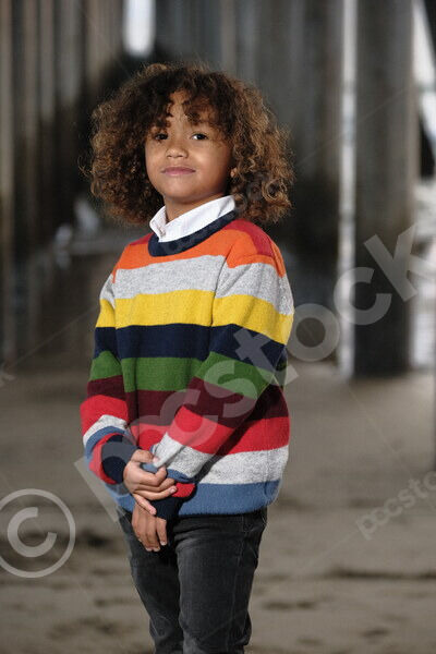 Smiling Mixed race little boy with curly hair standing under bridges near beach during daytime