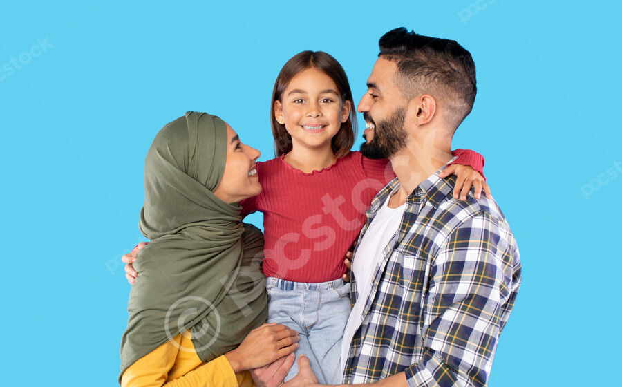 Arab father with beard and mother in hijab carrying and looking at their daughter while standing together against blue background in studio