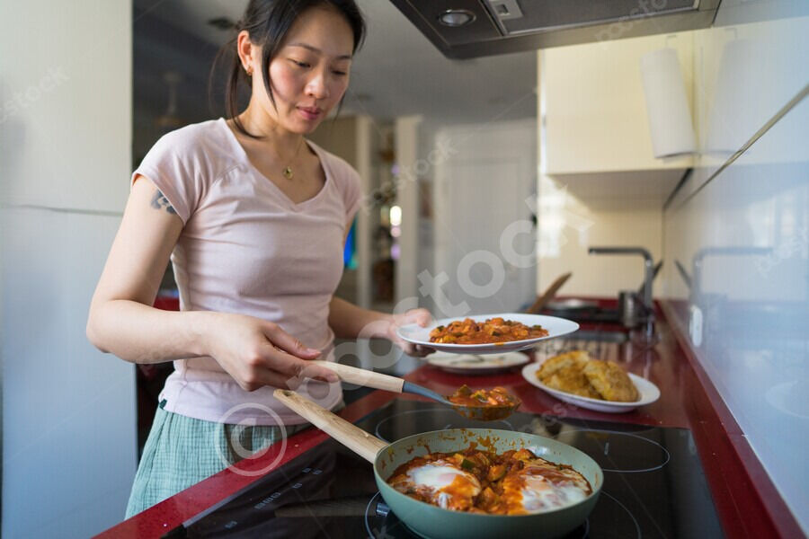 Chinese woman taking shakshouka from pan to plate while standing in kitchen at home