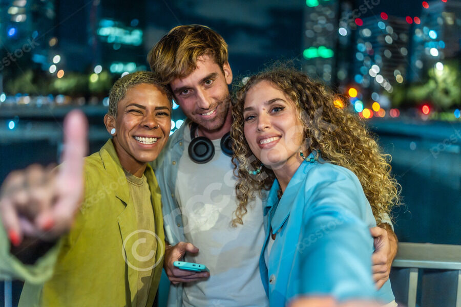 Diverse group of friends having fun taking selfie while standing together on city bridge at night