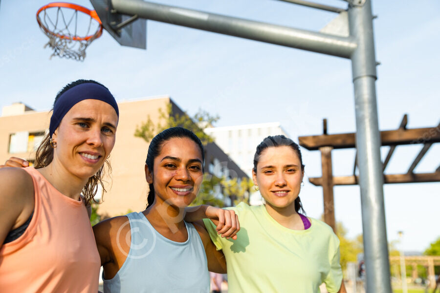 Hispanic woman with arms around shoulders of caucasian female friends standing in basketball court