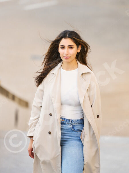 Middle Eastern woman wearing trench coat walking outdoors during daytime