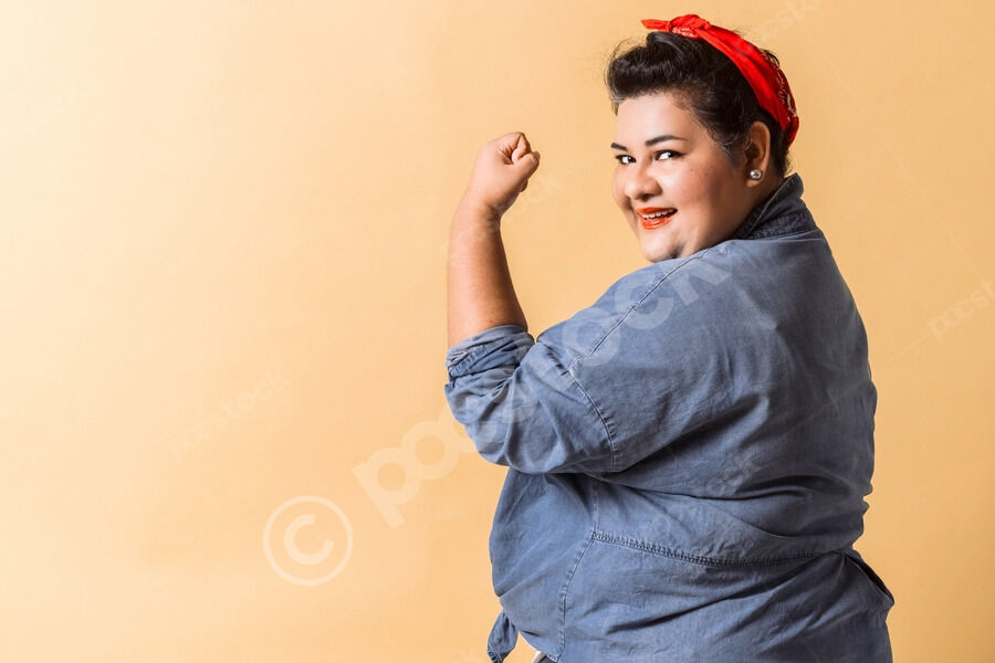 Plus-sized Honduran woman wearing denim shirt and red bandana making strong gesture and smiling standing sideways against brown background in studio